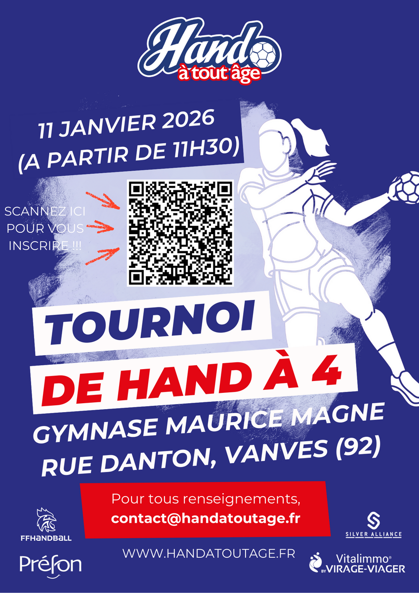 L'association "Hand A Tout Age", créée en 2023 qui fait la promotion du Hand à 4 pour les + 50 ans, organise un tournoi dimanche 11 janvier au gymnase Maurice Magne à Vanves.